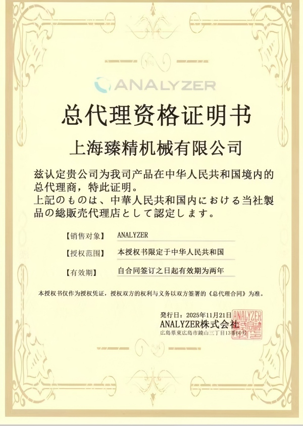 儀式現(xiàn)場,ANALYZER江崎社長親臨見證并授牌,正式授予上海臻精機械有限公司ANALYZER品牌全國總代理身份,雙方將深化協(xié)同聯(lián)動,全面統(tǒng)籌全國市場渠道拓展、產(chǎn)品推廣及客戶服務,助力ANALYZER激光缺陷檢測設備覆蓋更多行業(yè)應用場景。同時,為完善區(qū)域服務網(wǎng)絡,儀式同步授予重慶高品、長沙海貝智能、無錫微準、杭州朗多、浙江脈思科技省級代理資格,依托各區(qū)域合作伙伴本地資源優(yōu)勢,精準觸達區(qū)域客戶需求,提升產(chǎn)品服務響應效率與質(zhì)量。